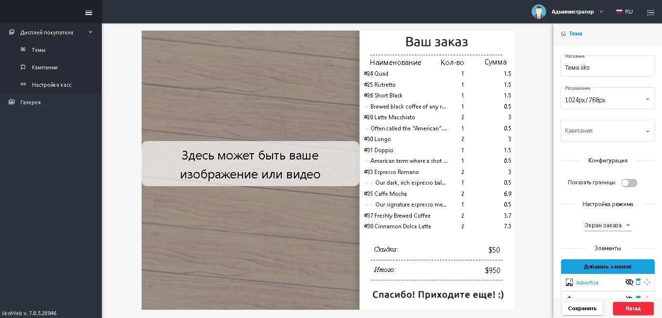 • Рекламный блок — блок, который сменяет изображения или показывает видео. Этот блок настраивается в Дисплее покупателя → Кампании. Более подробно мы рассмотрим этот элемент позже.