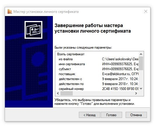 8. В окне Завершение мастера установки личного сертификата нажмите Готово: