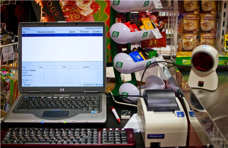 Кассовые узлы работают под управлением Frontol Торговля 5 ЕГАИС АСТОР. Рабочие места кассиров оборудованы современными POS-системами АТОЛ Супермаркет 10, в состав которых включены ККТ, денежный ящик и дисплей покупателя. Для сканирования товаров используются сканеры DataLogic QuickScan QD2430 с.